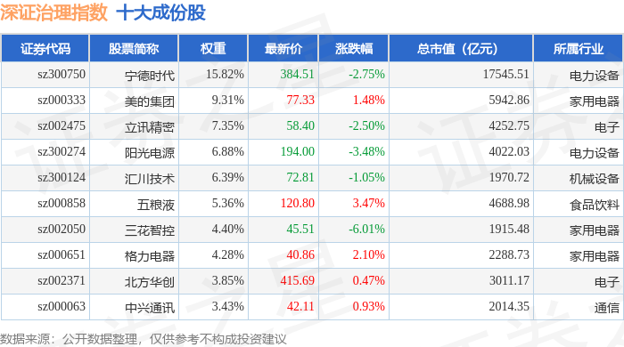 证券之星消息,11月10日,深证治理(399328)指数报收于11314.13点,跌0.26%,成交1105.38亿元,换手率1.93%。当日该指数成份股中,上涨的有28家,鲁西化工以9.99%的涨幅领涨,下跌的有12家,三花智控以6.01%的跌幅领跌。