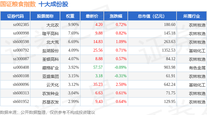 国证粮食(399365)指数十大成份股详情如下: