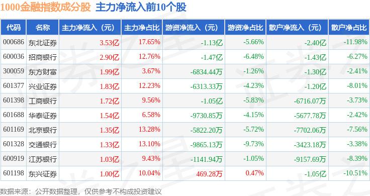 资金流向方面,1000金融(399387)指数成份股当日主力资金净流入合计16.29亿元,游资资金净流出合计4.33亿元,散户资金净流出合计11.96亿元。成份股资金流向详情见下表: