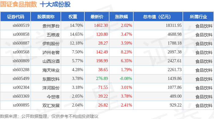国证食品(399396)指数十大成份股详情如下: