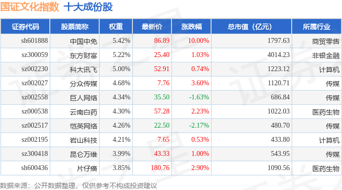 国证文化(399397)指数十大成份股详情如下: