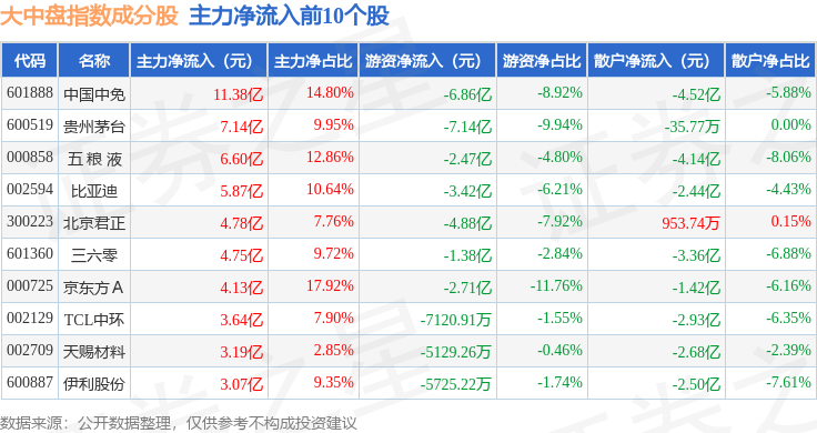 资金流向方面,大中盘(399400)指数成份股当日主力资金净流出合计182.08亿元,游资资金净流入合计23.7亿元,散户资金净流入合计158.37亿元。成份股资金流向详情见下表:
