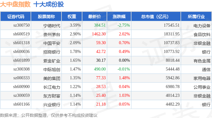 大中盘(399400)指数十大成份股详情如下: