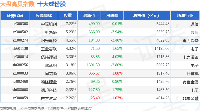 证券之星消息,11月10日,大盘高贝(399405)指数报收于3215.97点,跌0.09%,成交2224.64亿元,换手率1.55%。当日该指数成份股中,上涨的有32家,中国中免以10.0%的涨幅领涨,下跌的有18家,三花智控以6.01%的跌幅领跌。