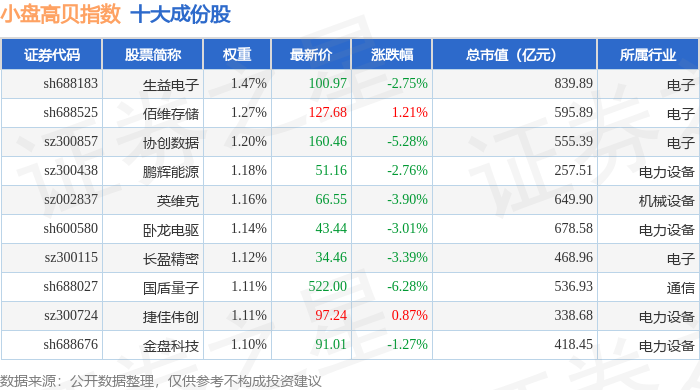 证券之星消息,11月10日,小盘高贝(399409)指数报收于6328.98点,跌0.18%,成交1375.76亿元,换手率3.85%。当日该指数成份股中,上涨的有90家,酒鬼酒以9.99%的涨幅领涨,下跌的有59家,厦钨新能以6.91%的跌幅领跌。