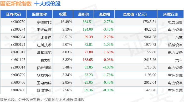 证券之星消息,11月10日,国证新能(399412)指数报收于3170.94点,跌1.02%,成交1575.48亿元,换手率2.19%。当日该指数成份股中,上涨的有23家,TCL中环以7.55%的涨幅领涨,下跌的有26家,欣旺达以7.01%的跌幅领跌。