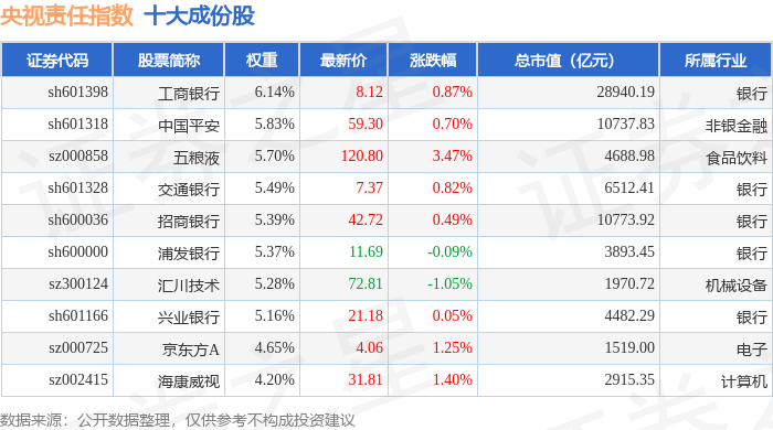 证券之星消息,11月10日,央视责任(399555)指数报收于5462.41点,涨0.72%,成交588.09亿元,换手率0.54%。当日该指数成份股中,上涨的有38家,南方航空以3.72%的涨幅领涨,下跌的有11家,宇通客车以2.58%的跌幅领跌。