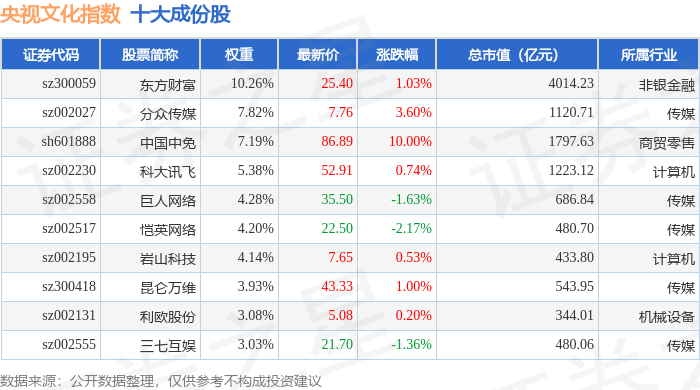 资金流向方面,央视文化(399557)指数成份股当日主力资金净流入合计15.21亿元,游资资金净流出合计8.3亿元,散户资金净流出合计6.91亿元。成份股资金流向详情见下表: