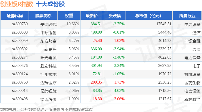 创业板R(399606)指数十大成份股详情如下: