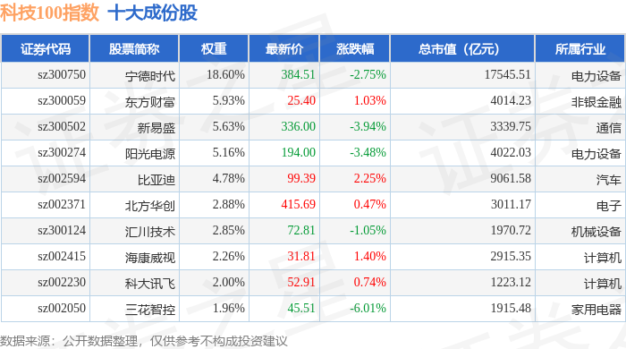 证券之星消息,11月10日,科技100(399608)指数报收于4188.15点,跌1.1%,成交2190.32亿元,换手率2.3%。当日该指数成份股中,上涨的有54家,雅克科技以7.58%的涨幅领涨,下跌的有45家,欣旺达以7.01%的跌幅领跌。