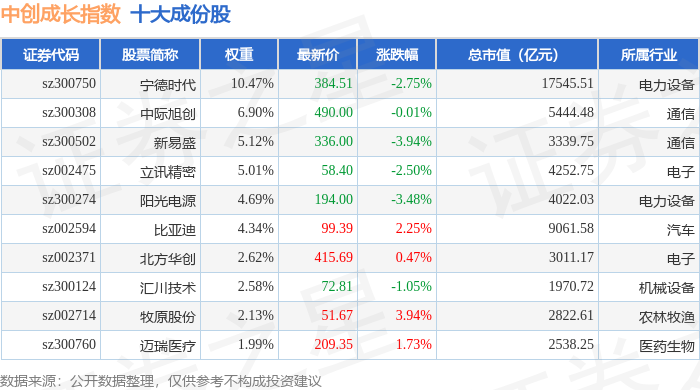 中创成长(399626)指数十大成份股详情如下: