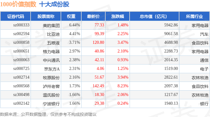 证券之星消息,11月10日,1000价值(399631)指数报收于2285.34点,涨1.11%,成交1877.52亿元,换手率1.67%。当日该指数成份股中,上涨的有232家,东北证券以10.03%的涨幅领涨,下跌的有93家,良信股份以10.03%的跌幅领跌。