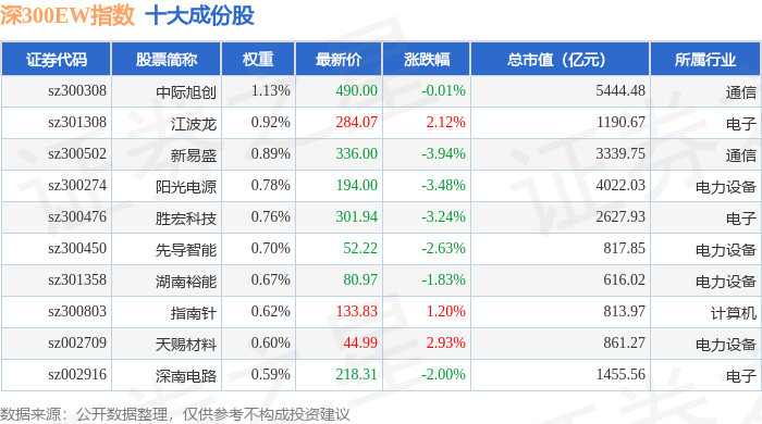 深300EW(399633)指数十大成份股详情如下: