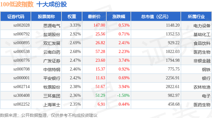 证券之星消息,11月10日,100低波(399645)指数报收于9797.28点,涨1.44%,成交659.25亿元,换手率1.11%。当日该指数成份股中,上涨的有45家,东方盛虹以6.13%的涨幅领涨,下跌的有4家,徐工机械以2.61%的跌幅领跌。
