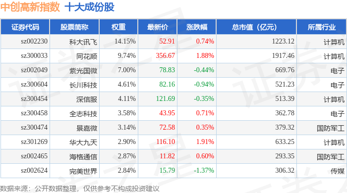 中创高新(399652)指数十大成份股详情如下: