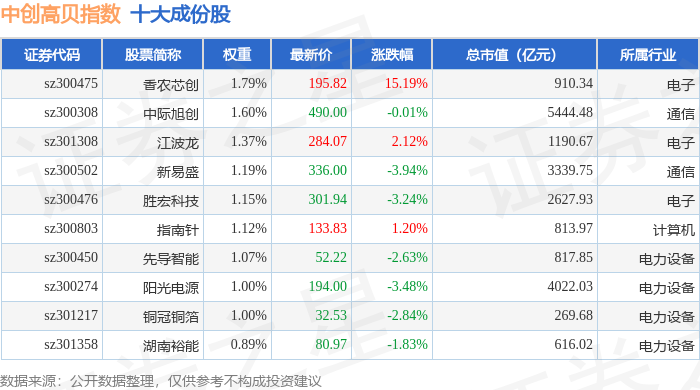 证券之星消息,11月10日,中创高贝(399666)指数报收于2041.09点,涨0.15%,成交3052.57亿元,换手率3.93%。当日该指数成份股中,上涨的有110家,香农芯创以15.19%的涨幅领涨,下跌的有88家,欣旺达以7.01%的跌幅领跌。