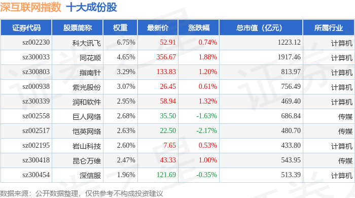 证券之星消息,11月10日,深互联网(399675)指数报收于3493.77点,涨0.39%,成交570.89亿元,换手率2.67%。当日该指数成份股中,上涨的有120家,威士顿以9.37%的涨幅领涨,下跌的有41家,鼎捷数智以11.88%的跌幅领跌。