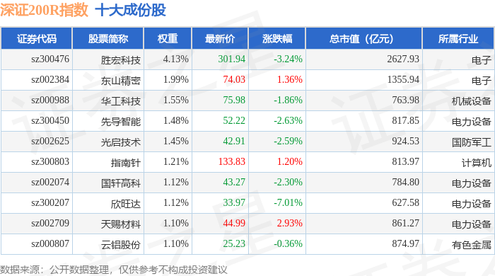证券之星消息,11月10日,深证200R(399679)指数报收于6214.73点,涨0.2%,成交2122.26亿元,换手率2.18%。当日该指数成份股中,上涨的有128家,北京君正以10.22%的涨幅领涨,下跌的有70家,杰瑞股份以7.46%的跌幅领跌。