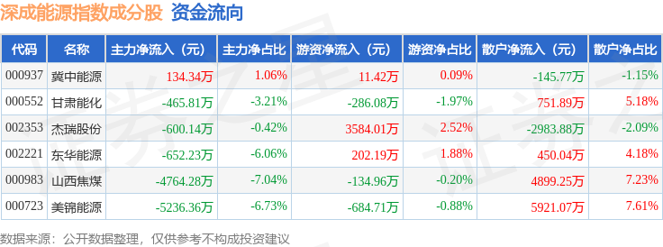 资金流向方面,深成能源(399680)指数成份股当日主力资金净流出合计1.16亿元,游资资金净流入合计2691.87万元,散户资金净流入合计8892.61万元。成份股资金流向详情见下表: