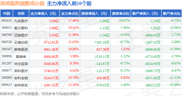 资金流向方面,深成医药(399685)指数成份股当日主力资金净流入合计10.24亿元,游资资金净流出合计5.57亿元,散户资金净流出合计4.67亿元。成份股资金流向详情见下表: