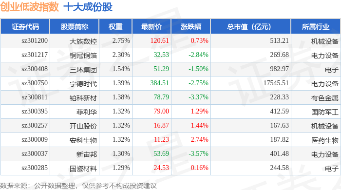创业低波(399692)指数十大成份股详情如下: