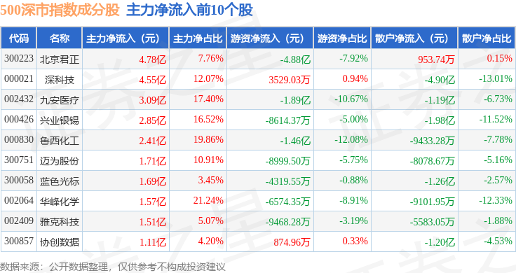资金流向方面,500深市(399802)指数成份股当日主力资金净流出合计42.17亿元,游资资金净流入合计6699.91万元,散户资金净流入合计41.5亿元。成份股资金流向详情见下表: