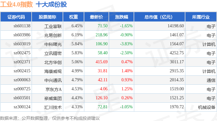 工业4.0(399803)指数十大成份股详情如下: