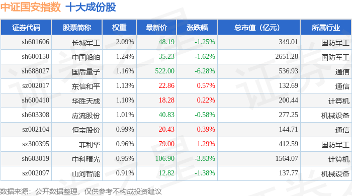 证券之星消息,11月10日,中证国安(399813)指数报收于7402.17点,跌0.07%,成交934.08亿元,换手率2.33%。当日该指数成份股中,上涨的有85家,浩云科技以6.05%的涨幅领涨,下跌的有68家,国盾量子以6.28%的跌幅领跌。