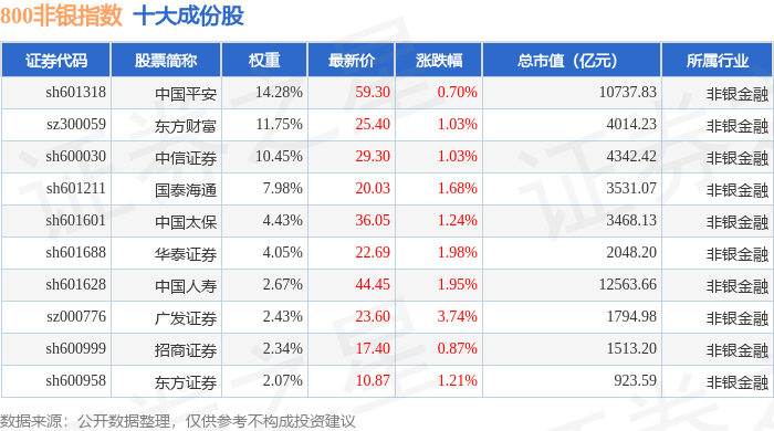 证券之星消息,11月10日,800非银(399966)指数报收于6599.08点,涨1.21%,成交428.81亿元,换手率0.87%。当日该指数成份股中,上涨的有50家,广发证券以3.74%的涨幅领涨。