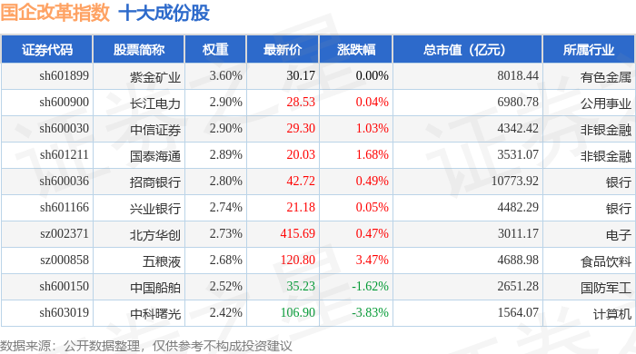 证券之星消息,11月10日,国企改革(399974)指数报收于1930.42点,涨0.73%,成交1568.44亿元,换手率0.76%。当日该指数成份股中,上涨的有72家,中国中免以10.0%的涨幅领涨,下跌的有26家,金风科技以6.36%的跌幅领跌。