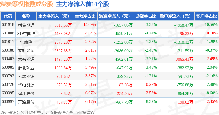 资金流向方面,煤炭等权(399990)指数成份股当日主力资金净流出合计9797.89万元,游资资金净流出合计1.56亿元,散户资金净流入合计2.54亿元。成份股资金流向详情见下表: