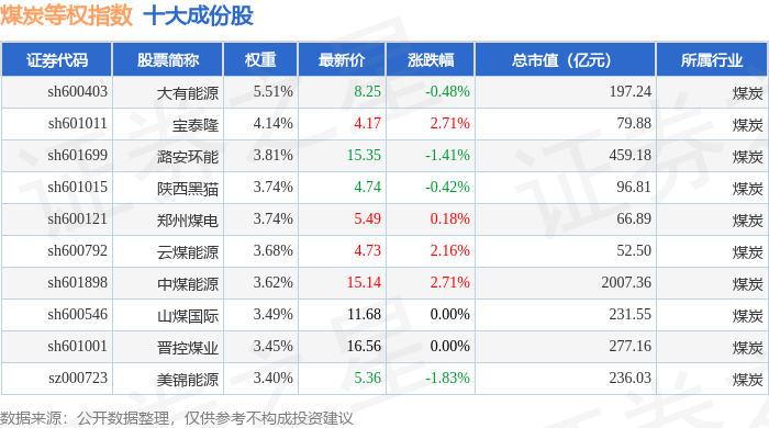煤炭等权(399990)指数十大成份股详情如下: