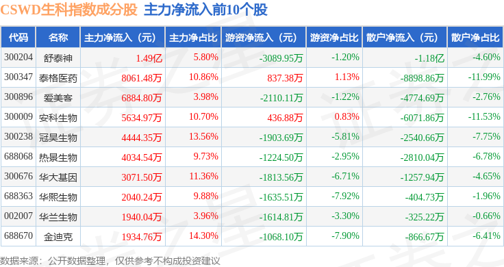 资金流向方面,CSWD生科(399993)指数成份股当日主力资金净流出合计4.07亿元,游资资金净流入合计2.25亿元,散户资金净流入合计1.82亿元。成份股资金流向详情见下表: