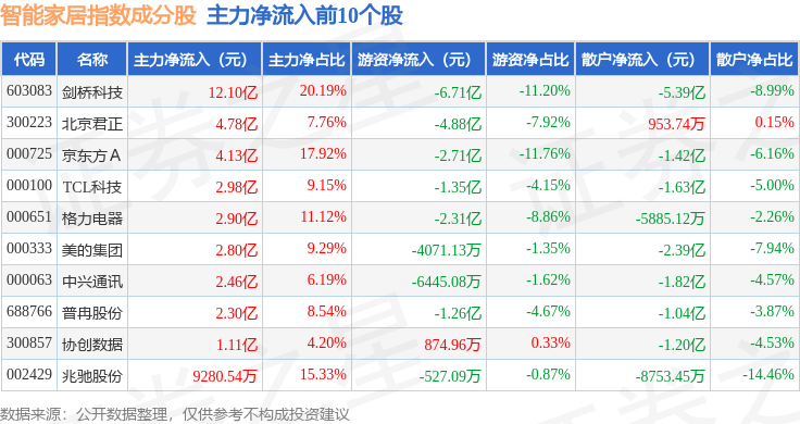 资金流向方面,智能家居(399996)指数成份股当日主力资金净流出合计43.18亿元,游资资金净流出合计2.58亿元,散户资金净流入合计45.76亿元。成份股资金流向详情见下表: