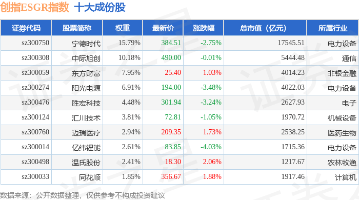 证券之星消息,11月10日,创指ESGR(470028)指数报收于3675.79点,跌0.71%,成交1600.84亿元,换手率2.81%。当日该指数成份股中,上涨的有51家,迈为股份以6.88%的涨幅领涨,下跌的有28家,欣旺达以7.01%的跌幅领跌。