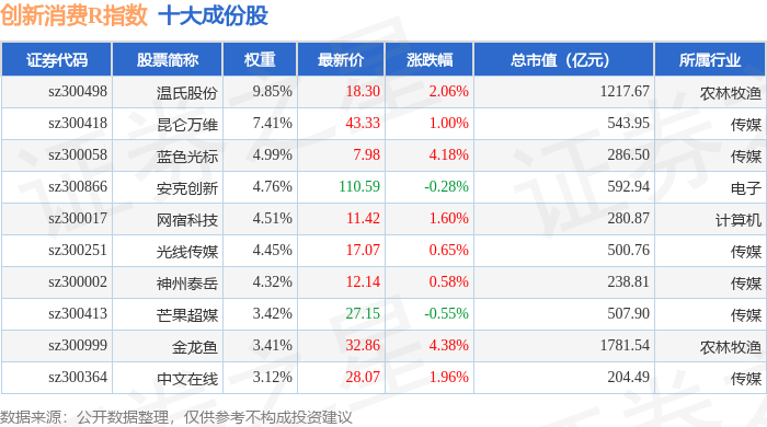 创新消费R(470041)指数十大成份股详情如下: