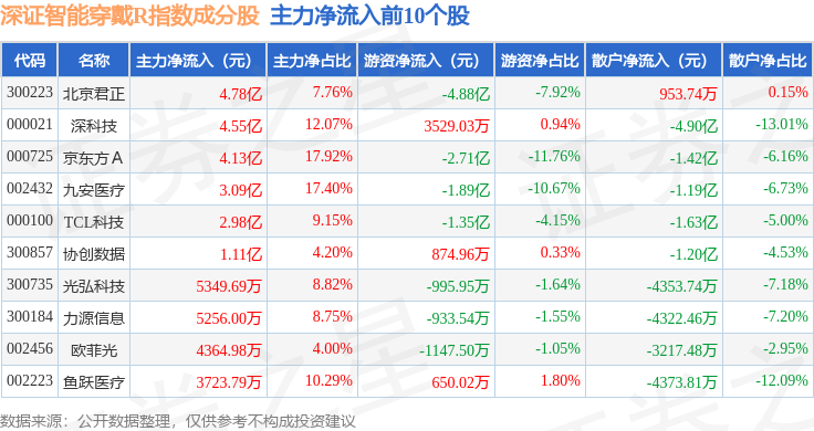 资金流向方面,深证智能穿戴R(470074)指数成份股当日主力资金净流出合计20.83亿元,游资资金净流出合计8.69亿元,散户资金净流入合计29.52亿元。成份股资金流向详情见下表: