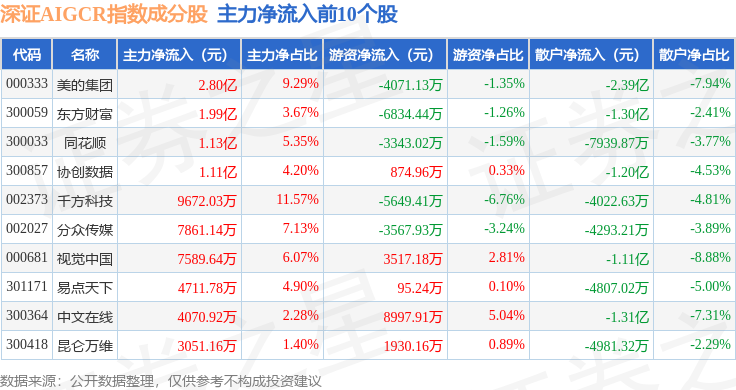 资金流向方面,深证AIGCR(470075)指数成份股当日主力资金净流出合计8909.25万元,游资资金净流入合计3.73亿元,散户资金净流出合计2.84亿元。成份股资金流向详情见下表: