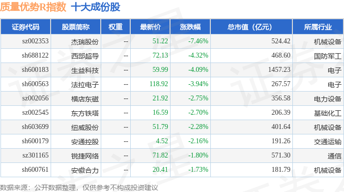 资金流向方面,质量优势R(489017)指数成份股当日主力资金净流出合计11.22亿元,游资资金净流入合计3.63亿元,散户资金净流入合计7.59亿元。成份股资金流向详情见下表:
