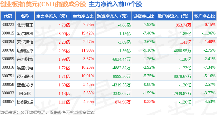 资金流向方面,创业板指(美元)(CNH)(970007)指数成份股当日主力资金净流出合计74.12亿元,游资资金净流入合计18.41亿元,散户资金净流入合计55.71亿元。成份股资金流向详情见下表: