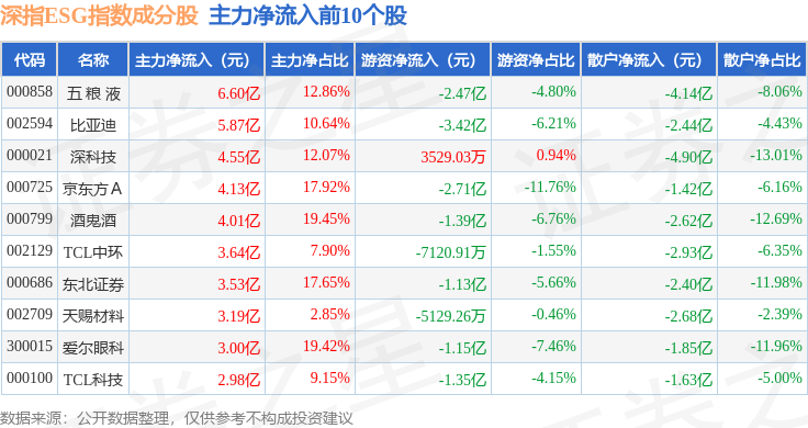 资金流向方面,深指ESG(970026)指数成份股当日主力资金净流出合计122.76亿元,游资资金净流入合计2.78亿元,散户资金净流入合计119.98亿元。成份股资金流向详情见下表: