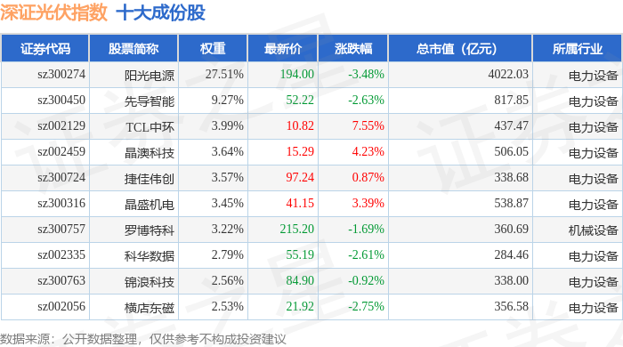 深证光伏(970035)指数十大成份股详情如下: