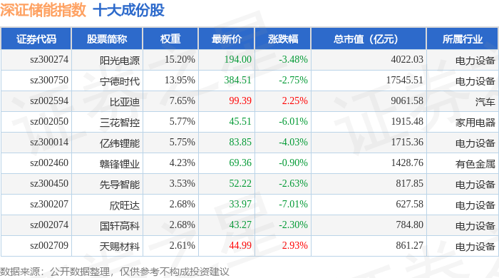 资金流向方面,深证储能(970036)指数成份股当日主力资金净流出合计78.74亿元,游资资金净流入合计15.34亿元,散户资金净流入合计63.4亿元。成份股资金流向详情见下表: