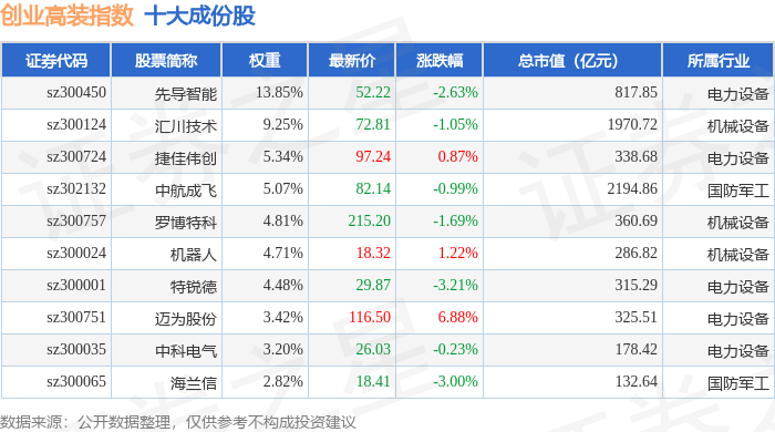 创业高装(970040)指数十大成份股详情如下: