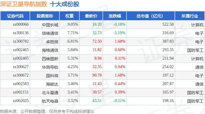 证券之星消息,11月10日,深证卫星导航(970050)指数报收于3206.06点,跌0.12%,成交169.63亿元,换手率3.14%。当日该指数成份股中,上涨的有26家,星网宇达以6.39%的涨幅领涨,下跌的有14家,信维通信以5.19%的跌幅领跌。