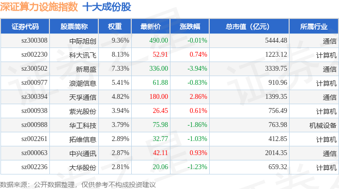 证券之星消息,11月10日,深证算力设施(970051)指数报收于11212.04点,涨0.16%,成交925.15亿元,换手率2.47%。当日该指数成份股中,上涨的有27家,北京君正以10.22%的涨幅领涨,下跌的有23家,新易盛以3.94%的跌幅领跌。