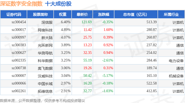 资金流向方面,深证数字安全(970052)指数成份股当日主力资金净流出合计14.02亿元,游资资金净流出合计7174.21万元,散户资金净流入合计14.73亿元。成份股资金流向详情见下表: