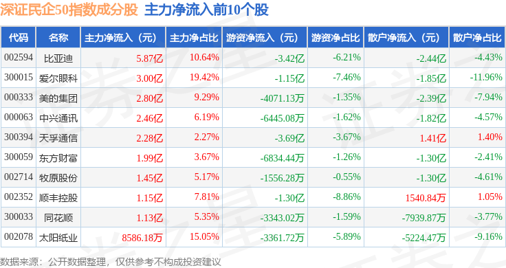 资金流向方面,深证民企50(970057)指数成份股当日主力资金净流出合计76.43亿元,游资资金净流入合计8.18亿元,散户资金净流入合计68.25亿元。成份股资金流向详情见下表: