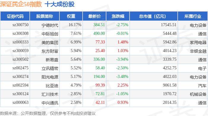 证券之星消息,11月10日,深证民企50(970057)指数报收于3380.99点,跌0.59%,成交1643.54亿元,换手率1.93%。当日该指数成份股中,上涨的有32家,华东医药以5.38%的涨幅领涨,下跌的有18家,杰瑞股份以7.46%的跌幅领跌。