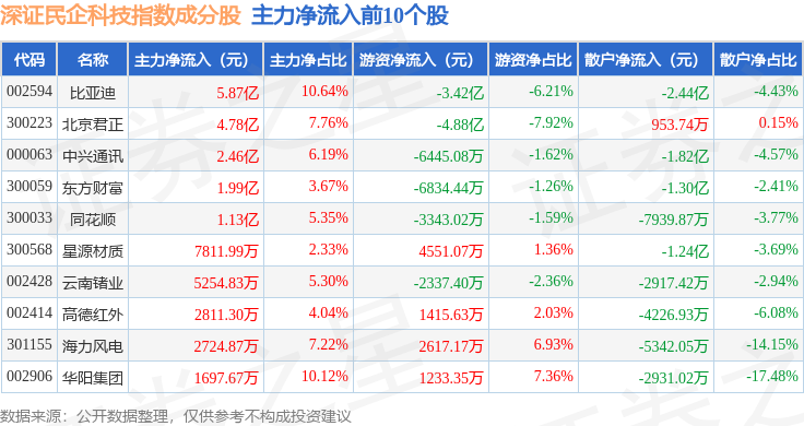 资金流向方面,深证民企科技(970059)指数成份股当日主力资金净流出合计25.23亿元,游资资金净流入合计4.98亿元,散户资金净流入合计20.24亿元。成份股资金流向详情见下表: